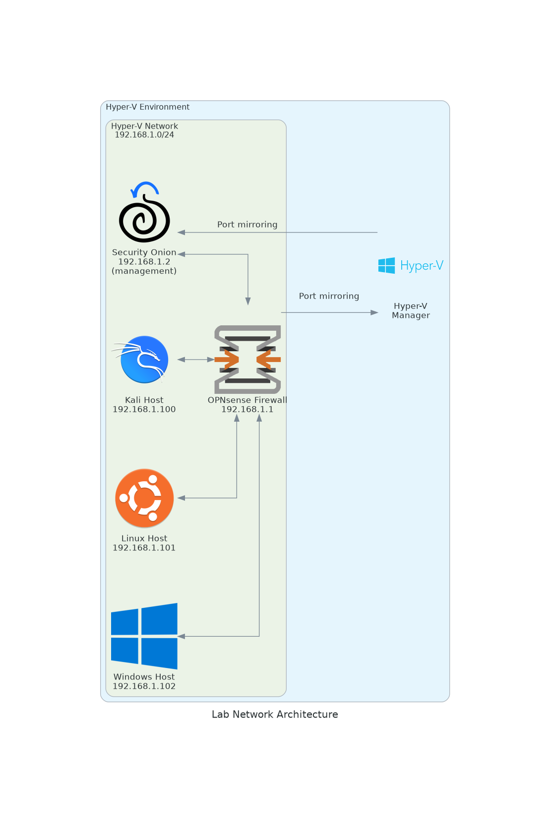 Security Onion was installed in standalone configuration. It connects to the OPNsense router through both its management interface (192.168.1.2) and port mirroring interface. The virtual LAN switch is assigned to the OPNsense VM as 'Source' and to the Security Onion VM as 'Destination' under Advanced Features in Hyper-V for port mirroring. This ensures that all network traffic that is flowing over the Lab LAN network is shared to Security Onion for further analysis.