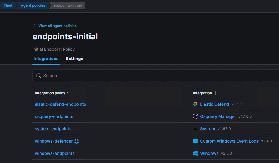 Integrations included in the Elastic Agent policy endpoints-initial for endpoints.